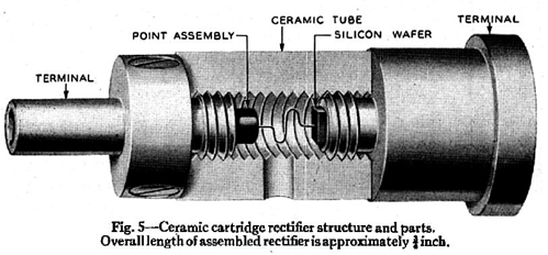 Corte transversal de un diodo rectificador de comienzos de la guerra fabricado por la compañía británica Thompson Houston. La figura está obtenida del artículo de J. H. Scaff y R. S. Ohl “Development of Silicon Crystal Rectifiers for Microwave Radar Receivers”, The Bell System Technical Journal, 26, 1 (1947)