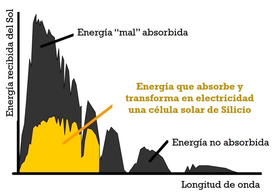 Las energías del espectro solar que absorbe adecuadamente una célula solar de silicio (en amarillo) y las que no se absorben o lo hacen de manera ineficiente (en gris)