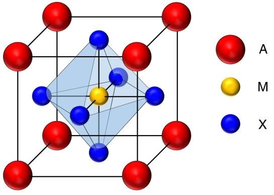 La perovskita es un mineral natural denominado titanato de calcio, cuya fórmula química es CaTiO3. Este mineral fue descubierto por primera vez por el mineralogista alemán Gustav Rose en 1839 y recibió su nombre en honor al mineralogista ruso Lev Perovski. Generalmente, los materiales que tienen la misma estructura cristalina del CaTiO3 se denominan materiales de perovskita. En general, tienen una composición genérica de la forma AMX3, donde A y M son cationes metálicos y X es un anión. La forma en la que los diferentes átomos del compuesto se agrupan en el espacio se muestra en la siguiente figura: