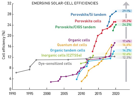 La carrera por la eficiencia de diversas células solares basadas en perovskitas, puesta en comparación con otras tecnologías emergentes. Como se indica al principio de este artículo, recientemente ya se ha superado la barrera del 30%