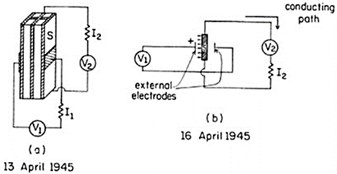 De hecho, podemos considerar que el camino hacia el transistor bipolar se inició en abril de 1945, cuando Shockley esbozó el diseño de un amplificador de «efecto de campo» en su cuaderno de laboratorio. La figura recoge la esencia del dispositivo ideado por Shockley y sus diseños en dos días de ese mes clave: