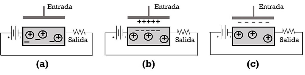 El dispositivo de efecto campo ideado por Shockley. (a) La estructura del dispositivo sin voltaje aplicado al electrodo de control. (b) Situación cuando se aplica una tensión positiva en la placa de control para aumentar la conductancia del semiconductor. (c) Situación al aplicar un potencial negativo en el electrodo de control para reducir la conductancia del semiconductor.