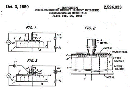 La primera de las cuatro patentes que obtuvieron durante el transcurso del trabajo. En ella se detallaba el principio de utilización de contactos puntuales sobre la superficie del silicio en una estructura que debería funcionar de manera análoga a un triodo de vacío.