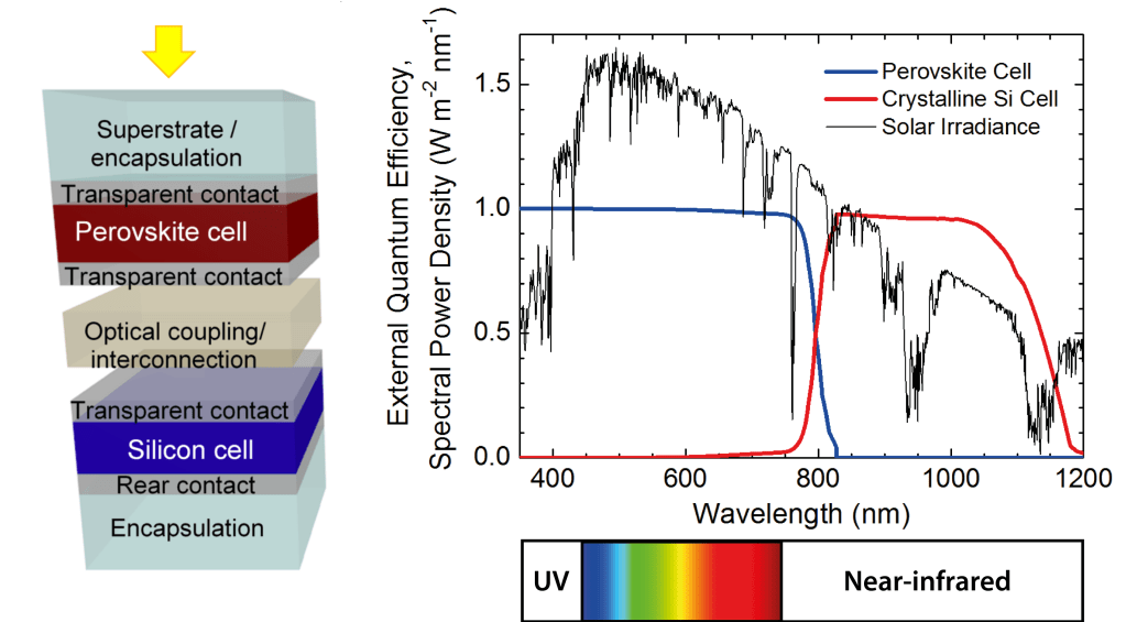 Ilustrando en concepto de célula solar tándem de silicio y perovskita (izquierda) y las zonas del espectro solar que absorbe cada célula individual (derecha)
