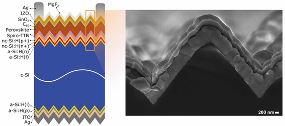 Izquierda: corte transversal de la estructura de una célula tándem de silicio y perovskita. Derecha: imagen tomada por microscopía electrónica de la estructura de la izquierda, donde se muestra perfectamente una de las pirámides de silicio recubierta con las diversas capas que componen la célula de perovskita. La escala de la imagen se detalla en la esquina inferior derecha