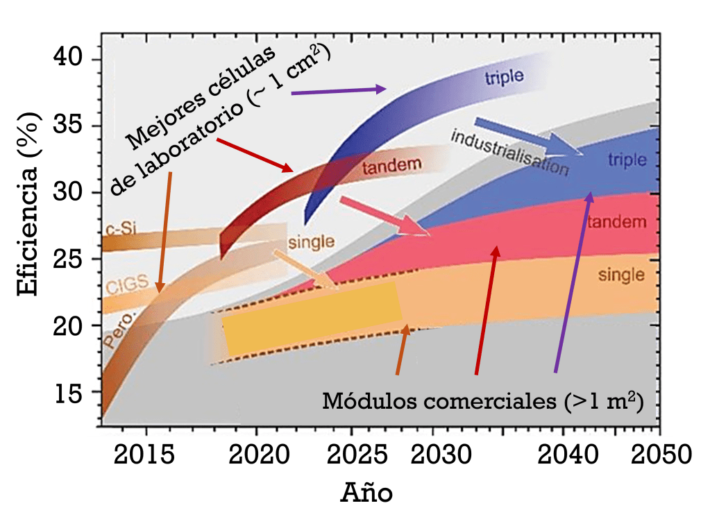 La siguiente figura muestra esquemáticamente las mejoras recientes y también las proyecciones potenciales de mejora de la eficiencia de las uniones simples de silicio, CIGS y perovskita, mostrando resultados de laboratorio y a escala industrial. Si bien en las tres tecnologías individuales son esperables mejoras en la eficiencia de conversión en los próximos años, no es probable que las uniones simples superen el límite práctico del ~ 27% (y ligeramente más bajo en módulos). Esto ha desencadenado un gran interés por la tecnología en tándem, que ya ha demostrado ser capaz de superar este límite práctico de unión única, puesto que muy recientemente se ha confirmado una eficiencia de una célula tándem silicio y perovskita por encima del 30%. Incluso ya se han publicado primeros resultados de dispositivos de tres uniones, con un potencial aún mayor: