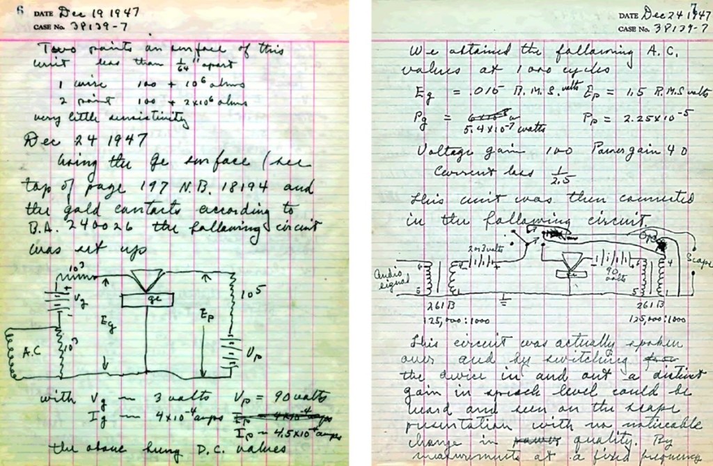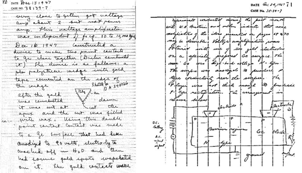 Izquierda: el cuaderno de laboratorio de Brattain, en una entrada del 16 de diciembre de 1947, en el que detalla cómo fabricó el transistor de puntas de contacto. Derecha: el cuaderno de laboratorio de Bardeen, en una entrada del 24 de diciembre de 1947, donde explica el principio de funcionamiento del dispositivo, que esta recogido en el párrafo precedente