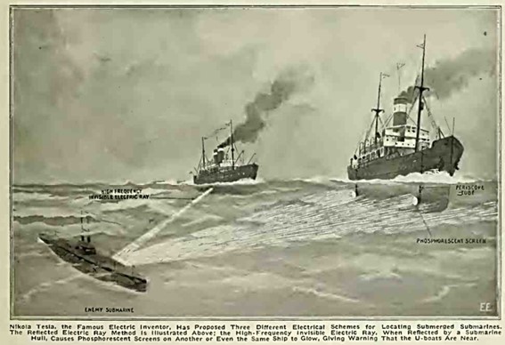La leyenda debajo del dibujo de dos barcos y un submarino sumergido en la primera página del artículo dice: Nikola Tesla, el famoso inventor eléctrico, ha propuesto tres esquemas diferentes para localizar submarinos sumergidos. El método del rayo eléctrico reflejado se ilustra arriba; un rayo eléctrico invisible de alta frecuencia, cuando se refleja en el casco de un submarino, hace que las pantallas fosforescentes en otro, o incluso en el mismo barco, brillen, advirtiendo que un submarino está cerca.