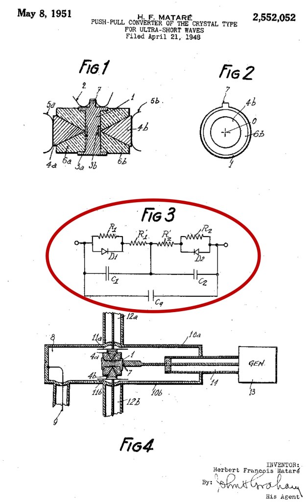 Página inicial de la patente US 2.552.052 de Herbert Mataré de abril de 1948 en la que se muestra el esquema del concepto de “duodiodo”. La figura 3 ilustra esa idea, que en su evolución posterior dio lugar a lo que hoy día conocemos como transistor bipolar, con dos uniones muy próximas e interdependientes