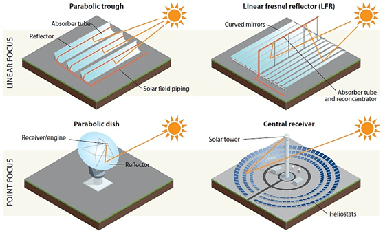 Las centrales CSP son de cuatro tipos principales: concentradores lineales cilindro-parabólicos, concentradores con lentes de Fresnel, concentradores de torre y concentradores de espejo parabólico (concentradores Stirling). En la siguiente figura se muestran los cuatro, cuyos fundamentos describo brevemente en el siguiente párrafo: