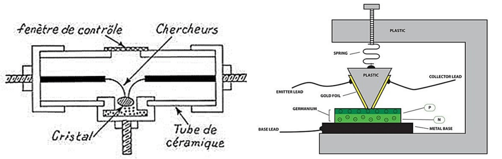 Izquierda: dibujo de la sección transversal del transistron. En el dibujo, las dos puntas metálicas (chercheurs) entran en contacto con la superficie de una lámina de germanio (cristal). Un técnico ajustaba las posiciones de los dos contactos para obtener las características eléctricas adecuadas a través de una ventana (fenêtre de contrôle). La estructura interna es similar al primer prototipo de transistor de puntas de contacto de los Bell Labs, que se ve en la parte derecha de la imagen