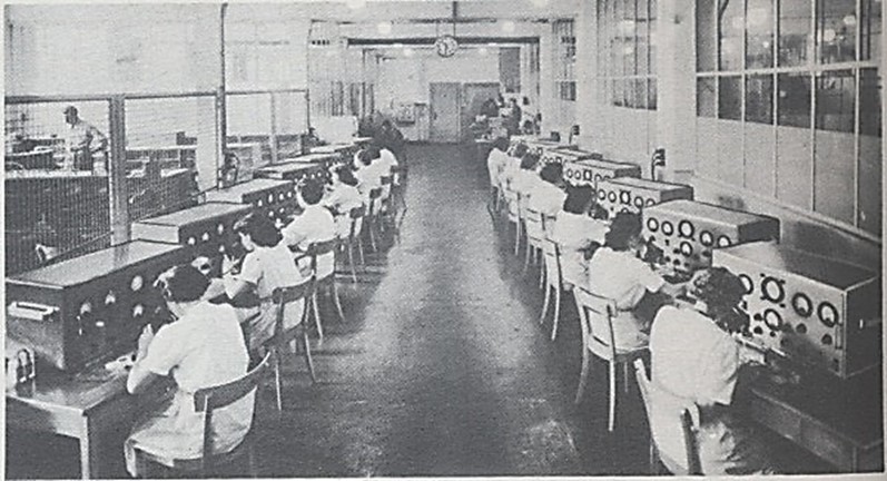 Trabajadoras de Intermetall realizando las pruebas de validación de los dispositivos fabricados. Intermetall utilizó 14 trazadores de características desarrollados internamente y mano de obra femenina para llevar a cabo las mediciones finales del rendimiento de los dispositivos que fabricaba