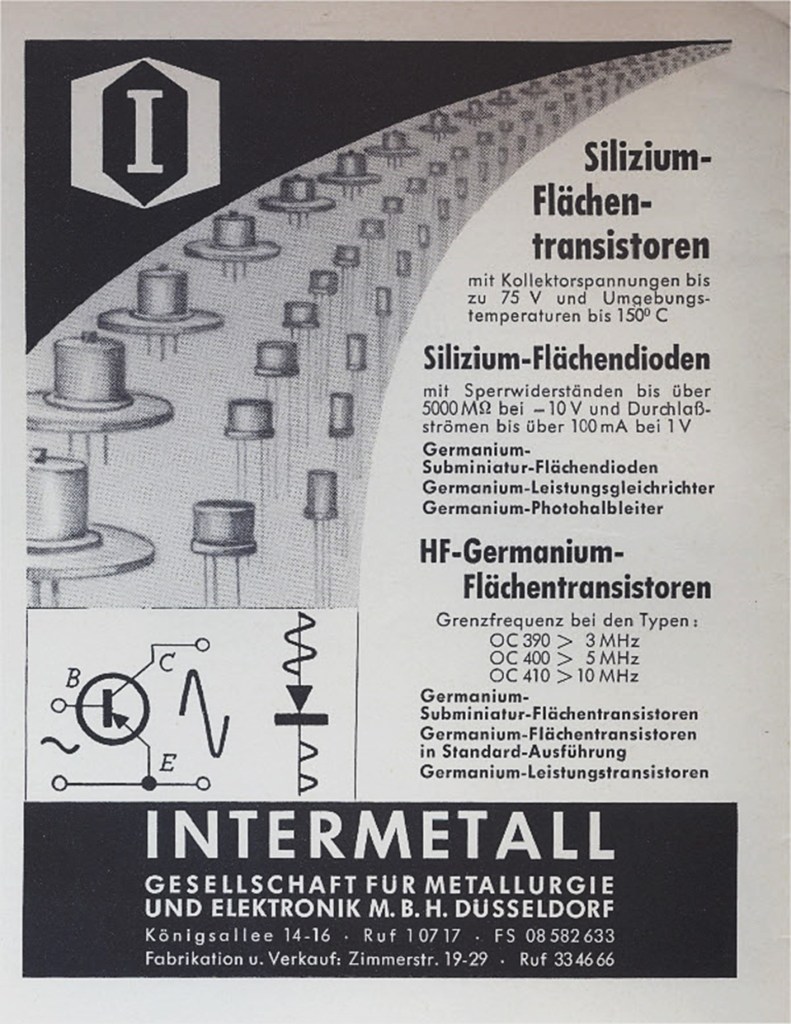 En 1956, Intermetall comenzó la comercialización de transistores de unión de silicio, tal y como señaló en un anuncio publicado en la prensa especializada alemana
