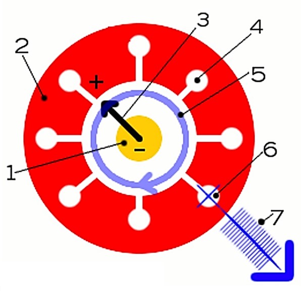 6. Entonces, cuando los electrones llegan a las cavidades, lo hacen con la energía que han adquirido del campo eléctrico, tal y como ya he indicado. Los electrones depositan carga en la cara interna del ánodo, es decir, en uno de los elementos de las cavidades resonantes, cargando los “condensadores”, que actúan como iniciadores de las oscilaciones en las cavidades. El resultado de estas oscilaciones es la producción de o.e.m. Como todas las cavidades son idénticas, todas resuenan a la misma frecuencia. Es decir, todas contribuyen colectivamente a obtener o.e.m. de una frecuencia que viene definida por la geometría de las cavidades.