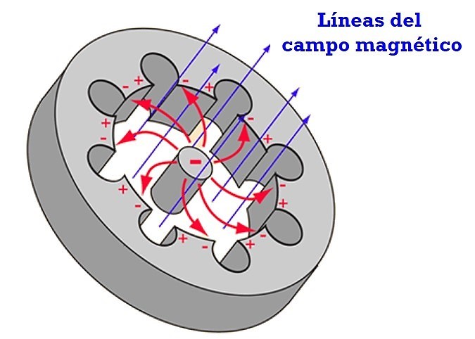 Una vista en perspectiva del magnetron de cavidades resonantes en la que se puede visualizar cómo son las trayectorias de los electrones en presencia del campo magnético aplicado según se muestra en la imagen. Los electrones emitidos por el cátodo viajarían radialmente hacia el ánodo en ausencia de campo magnético. En presencia del mismo, realizan trayectorias curvilíneas, ganando energía y “bombeándola” hacia las cavidades resonantes horadadas en el ánodo