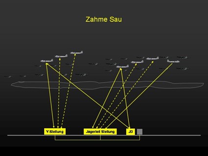 Zahme Sau. A diferencia del Wilde Sau, los bombarderos enemigos eran “acompañados” por aviones que transmitían la posición del enemigo. De esta manera, no se dependía de las unidades de reflectores de tierra para localizar a los bombarderos.