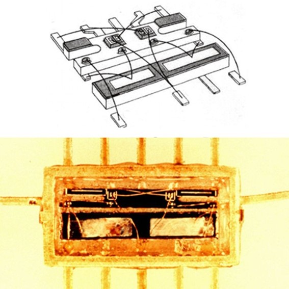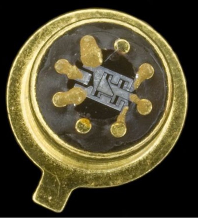 Imagen tomada al microscopio del circuito «F» Flip-Flop, fabricado con la tecnología planar. Integrar cuatro transistores y seis resistencias en un chip planteaba muchos nuevos retos de ingeniería. Este primer prototipo funcionó en mayo de 1960