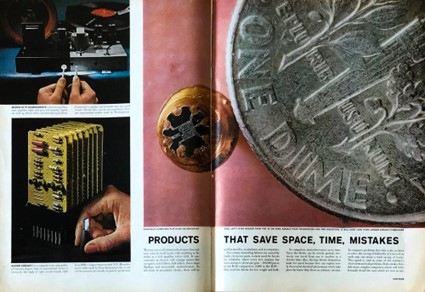 Una foto de páginas interiores del número de 10 de marzo de 1961 de la revista LIFE. En un artículo titulado «Una revolución en dispositivos diminutos», se comparaba el nuevo chip de Fairchild con el tamaño de una moneda de diez centavos de dólar (1.8 cm. de diámetro). El texto decía: «Su función es conmutar, amplificar y alterar la corriente eléctrica igual que hacen los transistores y las válvulas de vacío, pero uno de ellos equivale a una docena de válvulas, más varios metros de cableado». El dispositivo de la imagen contenía cuatro transistores