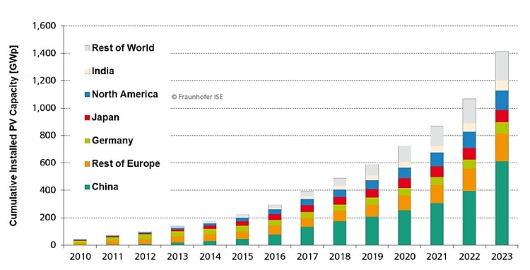 Potencia fotovoltaica instalada y acumulada en el planeta, para el período 2010-2023