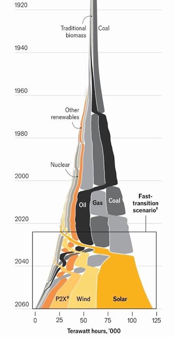 Y las perspectivas de evolución en las próximas décadas son espectaculares. La revista The Economist lo mostró hace poco en una gráfico, que muestra que, en un «escenario de transición rápida», la energía solar será la principal fuente de energía del mundo en 2040.