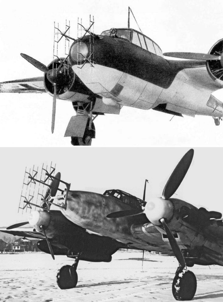 Figura 2. El primero de los radares Lichtenstein, denominado FuG 202 instalado en dos cazas nocturnos de la Luftwaffe. Arriba: Dornier Do 217. Abajo: Messerschmitt Bf 110.