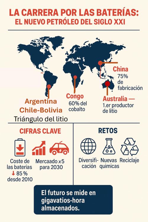 🎯 Si el petróleo definió la geopolítica del siglo XX, las baterías de litio están definiendo la del XXI. Cada móvil 📱, coche eléctrico 🚗🔌 o red renovable ⚡ necesita baterías, y quien controle su producción tendrá en sus manos la llave de la transición energética.