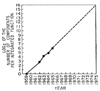 Trazando una línea a través de sólo cinco puntos de datos, se aventuró a decir que «con la reducción del coste unitario a medida que aumenta el número de componentes por circuito, en 1975 la economía y la tecnología podría permitir la inclusión de hasta 65.000 componentes en un único chip de silicio«. Esto indicaba que, cada doce meses, se duplicaría el número de transistores integrados en un chip.
