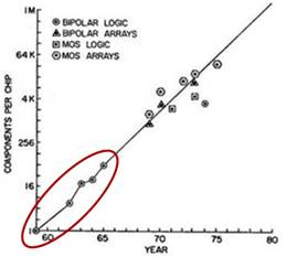 La gráfica original de Gordon Moore, que dio lugar a su muy famosa ley. Obsérvese que está construida con cinco puntos únicamente