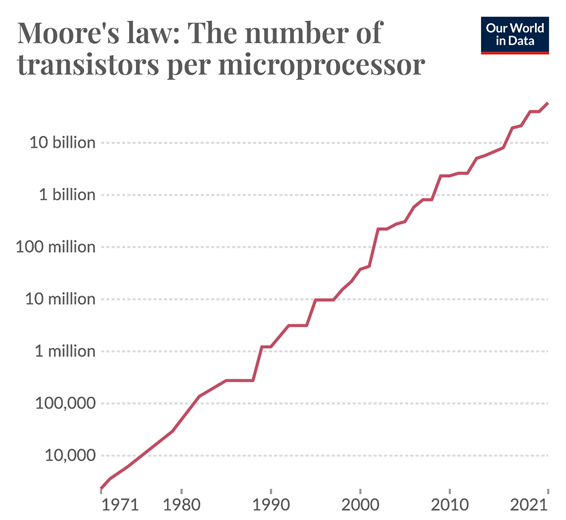 - Porque nos recuerda el increíble poder del crecimiento exponencial. Lo que parecía un exceso de optimismo en 1965 se tradujo en décadas de progreso real.