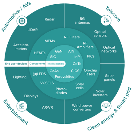 Por eso, la industria ya habla de estrategias como More than Moore: en lugar de seguir apilando transistores en el plano tradicional 2D, se exploran nuevas vías, como la integración tridimensional de circuitos (3D), apilamiento vertical, nuevos materiales, nuevos enfoques arquitectónicos…(https://www.itrs2.org/uploads/4/9/7/7/49775221/irc-itrs-mtm-v2_3.pdf). La siguiente imagen ilustra los principales campos de aplicación de los dispositivos More than Moore (MtM). En el centro se pueden ver diversos materiales MtM, y más hacia el exterior se pueden ver componentes MtM y dispositivos de usuario final para los cuatro campos de aplicación