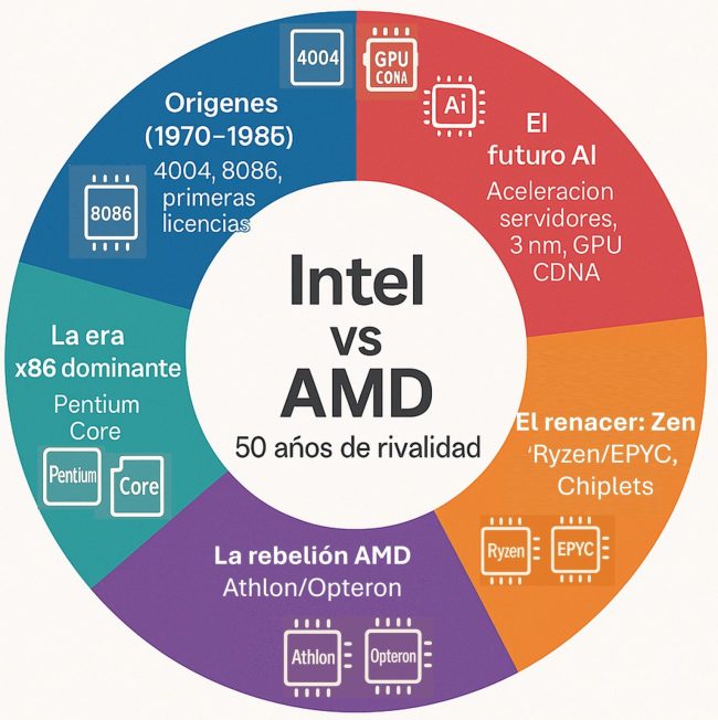 Durante más de cinco décadas, dos nombres lo han cambiado todo en el corazón del ordenador 💻: Intel y AMD. No es solo una historia de chips o transistores…es una batalla por velocidad, eficiencia, prestigio y liderazgo tecnológico. Una guerra en la que ambos han ganado, perdido y vuelto a reinventarse 🔥.
