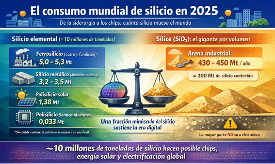 Resulta paradójico, ya que estamos hablando del segundo elemento más abundante de la corteza terrestre, presente en forma de arena, rocas y minerales. Y, sin embargo, el silicio se ha convertido en un recurso estratégico de primer orden. El pasado año 2025, el mundo consumió alrededor de 10 millones de toneladas métricas de silicio elemental, frente a cientos de millones de toneladas de sílice para vidrio y construcción (alrededor de 430-450 millones de Tm), lo que explica por qué una fracción minúscula del silicio sostiene la electrónica, la energía solar y la economía digital global (https://pubs.usgs.gov/periodicals/mcs2025/mcs2025-sand-industrial.pdf). La imagen es un resumen gráfico basado en la referencia señalada: