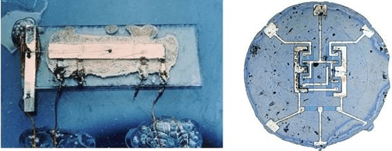 Las concepciones del circuito integrado de Kilby (i) y Noyce (d). La escala de las imágenes no es la misma
