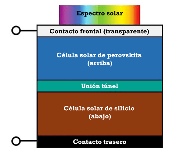 Esquema en corte transversal de una célula tándem compuesta por una célula de silicio y una de perovskita
