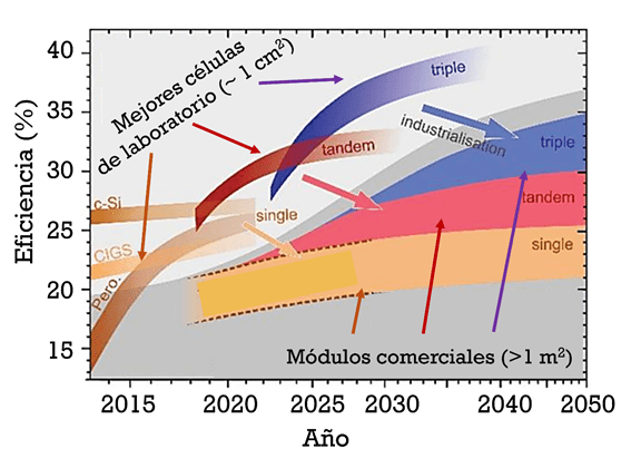No se trata de una promesa lejana: empresas como Oxford PV, Tandem PV o incluso grandes fabricantes asiáticos están avanzando hacia la industrialización de esta tecnología. La siguiente imagen muestra los posibles escenarios de mejora de eficiencia en dispositivos fotovoltaicos basados en Si, CuInGaSe2 (CIGS) y perovskitas, tanto en células individuales como en tándem y en triple unión, de aquí a 2050.