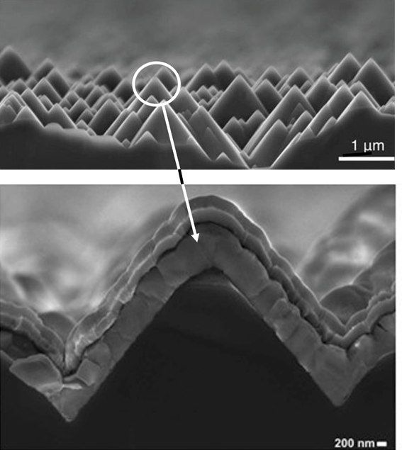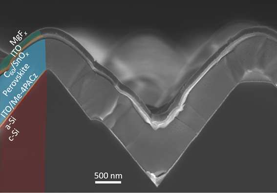 A pesar de su enorme potencial, el tándem silicio-perovskita aún enfrenta desafíos clave. Uno de los más complejos es cómo integrar la perovskita sobre la superficie real de una célula de silicio, que no es plana, sino texturizada en forma de pirámides microscópicas para maximizar la absorción de luz. La siguiente figura es una imagen compuesta para ilustrar este concepto clave. En la parte superior, se aprecia la superficie texturizada del Si utilizado en células solares observada al microscopio. Como ya se ha dicho, la superficie tiene una estructura irregular, constituida por pirámides cuyo objetivo es incrementar la absorción de luz. En la parte inferior se observa una de las pirámides de Si totalmente recubierta con las diversas capas que componen la célula de perovskita. La escala de cada imagen se detalla en la esquina inferior derecha.