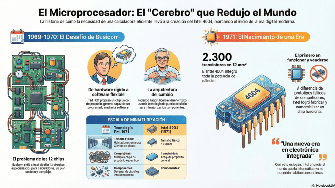 Esta es la historia de cómo nació el primer microprocesador comercial, el Intel 4004, y de cómo esa pequeña pieza de silicio cambió para siempre la historia de la tecnología y de la sociedad.