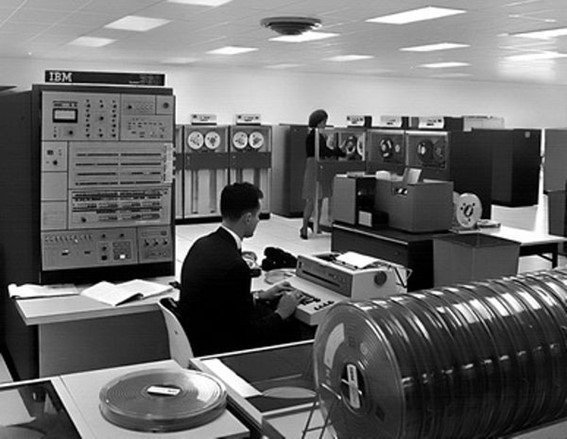 A finales de los años sesenta, Intel era una empresa joven con un objetivo muy claro: dominar el mercado emergente de las memorias de semiconductores. Quería reemplazar las memorias de núcleos magnéticos que utilizaban los ordenadores de la época y sustituirlas por memorias RAM fabricadas sobre silicio. En aquel momento, la informática estaba dominada por grandes sistemas, que apenas cabían en una habitación. La siguiente imagen muestra uno de tales sistemas, el IBM System 360: