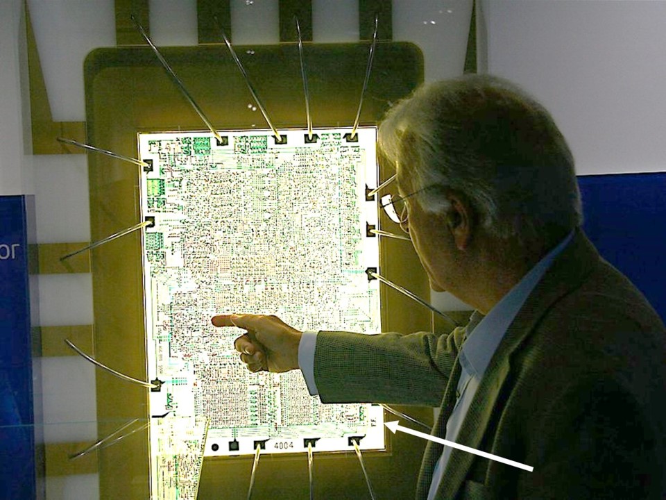 La siguiente fotografía muestra a Federico Faggin delante de una imagen ampliada del Intel 4004. En la esquina inferior derecha, señalado con una flecha, figuran grabadas las iniciales F.F. de Federico Faggin, autor del diseño del layout del 4004. Las dimensiones reales del chip eran 4 × 3 mm.