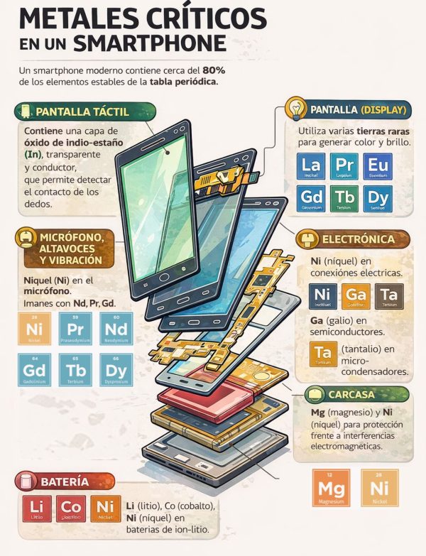 🗺️ Lo interesante es que muchos de estos materiales se consideran recursos críticos, bien por su escasez geológica o por su concentración en determinadas regiones del planeta. Por eso, detrás de cada smartphone existe una historia global que conecta minería, geopolítica, semiconductores y transición energética.