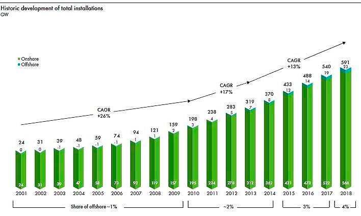 2018 fue un año muy positivo para la industria de la energía eólica, con 51,3 GW de nuevas instalaciones desplegadas por todo el planeta.