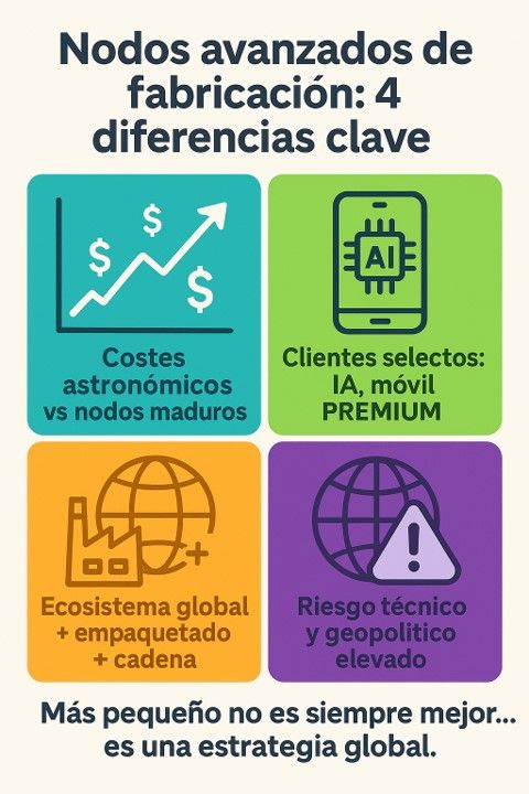 ¿Qué diferencia a los nodos “leading-edge” (7 nm, 5 nm, 3 nm) de los ya maduros (28 nm, 40 nm, 65 nm)?